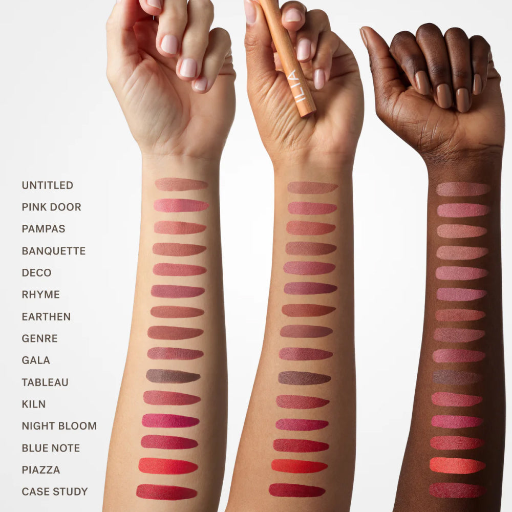 tridecyl trimellitate / octyldodecanol / dicalcium phosphate / synthetic wax / caprylic/capric triglyceride / diisostearyl malate / synthetic beeswax / helianthus annuus (sunflower) seed wax / rosa canina fruit oil / salicornia herbacea extract / undaria pinnatifida extract / sodium hyaluronate / rubus idaeus (raspberry) leaf extract / ricinus communis (castor) seed oil / disteardimonium hectorite / propylene carbonate / pentaerythrityl tetra-di-t-butyl hydroxyhydrocinnamate / hydrogenated castor oil / barium sulfate. may contain/peut contenir (+/-): ci 77891 (titanium dioxide) / ci 15850 (red 7 lake) / mica / ci 15850 (red 6) / ci 19140 (yellow 5 lake) / ci 15850 (red 7) / ci 77491 / ci 77492 / ci 77499 (iron oxides) / ci 15850 (red 7) / ci 45410 (red 28 lake) / ci 42090 (blue 1 lake) / ci 45380 (red 22 lake) / ci 15985 (yellow 6 lake).• start by following your own lip contour and create the shape you want