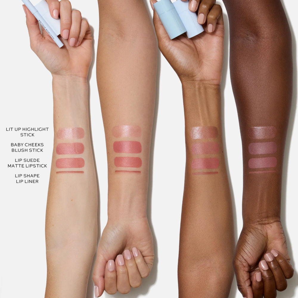 baby cheeks blush stick: caprylic/capric triglyceride / kaolin / caprylyl caprylate/caprate / simmondsia chinensis (jojoba) seed oil / polyethylene / mica / polyhydroxystearic acid / lecithin / behenylcarbamoylpropyl polysilsequioxane / tocopherol / ascorbyl palmitate / citric acid / rubus idaeus leaf cell culture / may contain/peut contenir (+/-): titanium dioxide (ci 77891) / iron oxides (ci 77491 / 77492 / 77499) / red 30 lake (ci 73360) / blue 1 lake (ci 42090) / red 7 lake (ci 15850) / yellow 5 lake (ci 19140) lit up highlight stick: diisostearyl malate / octyldodecanol / tridecyl trimellitate / synthetic wax / dimer dilinoleyl dimer dilinoleate / mica / glyceryl behenate/eicosadioate / synthetic beeswax / caprylic/capric triglyceride / vitis vinifera (grape) fruit extract / calcium sodium borosilicate / calcium aluminum borosilicate / dicalcium phosphate / silica / tin oxide / pentaerythrityl tetra-di-t-butyl hydroxyhydrocinnamate lip suede matte lipstick: isoamyl laurate / isodecyl neopentanoate / octyldodecanol / silica / synthetic wax / dicalcium phosphate / c10-18 triglycerides / helianthus annuus (sunflower) seed wax / kaolin / limnanthes alba (meadowfoam) seed oil / candelilla cera/euphorbia cerifera (candelilla) wax/cire de candelilla / synthetic beeswax / ethylhexyl palmitate / silica silylate / caprylic/capric triglyceride / polyhydroxystearic acid / tetrahexyldecyl ascorbate / tocopheryl acetate / disteardimonium hectorite / ethyl vanillin / tribehenin / isostearic acid / lecithin / pentaerythrityl tetra-di-t-butyl hydroxyhydrocinnamate / polyglyceryl-3 polyricinoleate / ricinus communis (castor) seed oil / sorbitan isostearate / hydrolyzed sodium hyaluronate / sodium hyaluronate / lactic acid / hydrogenated castor oil / palmitoyl tripeptide-1 lip shape lip liner - simmondsia chinensis (jojoba) seed oil / cera carnauba/copernicia cerifera (carnauba) wax/ cire de carnauba / dextrin isostearate / squalane / caprylic/capric triglyceride / dicalcium phosphate / candelilla cera/euphorbia cerifera (candelilla) wax / castor isostearate succinate / mica / hydrogenated castor oil / calcium silicate / tocopherol